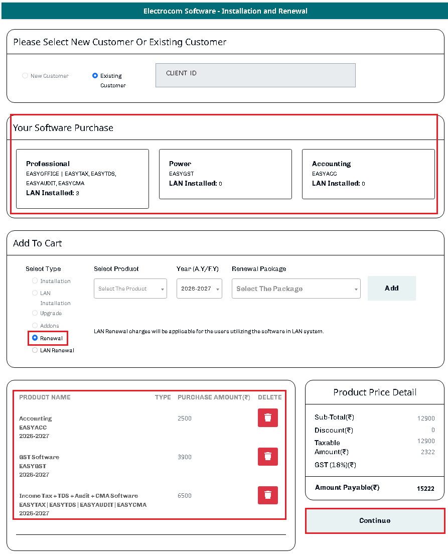 Step -2:- Renewal order will be opened on website where renewal amount will be auto fetched as per your previous purchased software’s. Confirm your product price detail then click on “continue” button