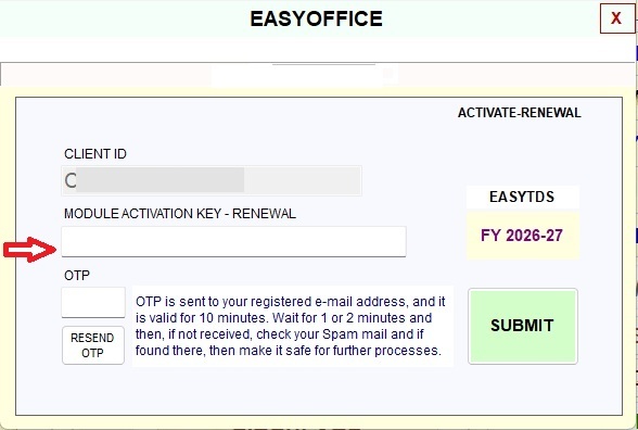Step - 7:- Enter module renewal activation key and OTP, which are received on your registered mail. Then submit. Module will be activated for Relevant AY.